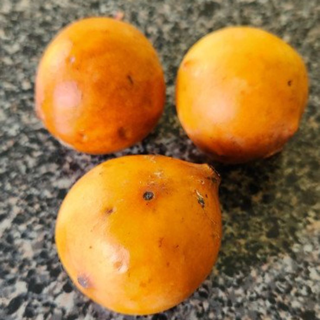 AchachairĂº originated in Bolivia. It was renamed in Australia as Achacha (last three letters removed) for convenient pronunciation. It’s in the same genus as mangosteen, gamboge, and imbe (garcinia) and has very similar visual and texture characteristics to the fruits in its genus. It looks like an imbe on the outside and a mangosteen on the inside.