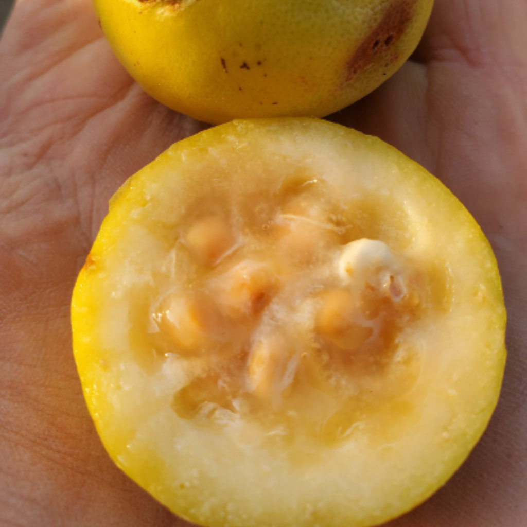 Robustum (Araza Grande) is a rare tropical fruit and a close relative of guava. Our seeds were sourced from a grower in Brazil because they are so difficult to find stateside. While a tropical/subtropical tree, psidiums in general are quite cold hardy. Ideal for zones down to 9a or even colder climates if afforded winter protection. This species is very tough (hence the name “robustum”), hardy down to 26-27°F, and can take long periods of drought once established. This species is practically unknown outside of its native Brazil, where it is called arazá-açú or arazá da areia.