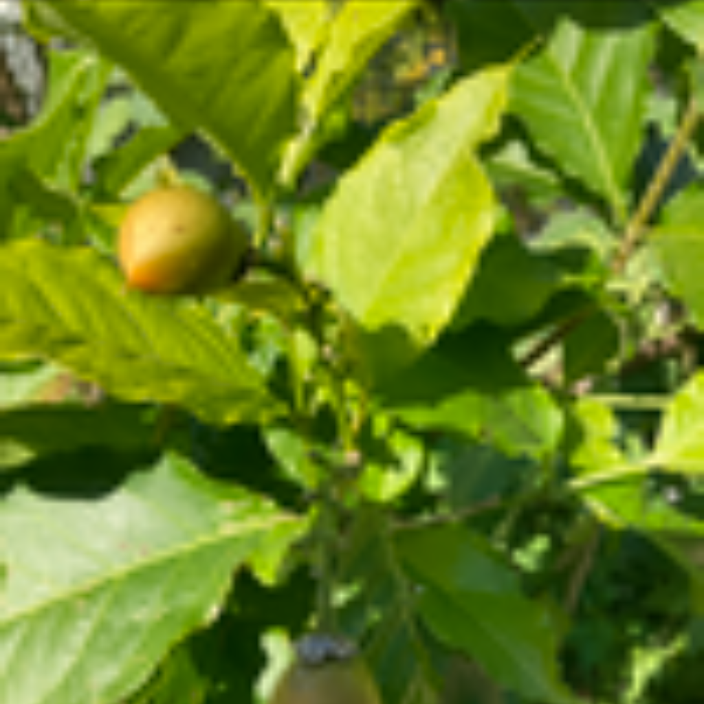 This fruit really does taste like a cross between peanut butter and a strawberry jam. These plants are second generation, meaning that they have either been started from seed or from cuttings of the mother plant which first bore fruit atop the body of a dog named Banjo. I loved Banjo very much. I love these fruit, the flowers, and the foliage. You will, too. These plants come in a one gallon pot.